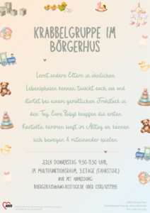 bei uns im Börgerhus startet wieder eine Krabbelgruppe! Geplante Zeit: Donnerstags 9:30-11:30 Uhr.
